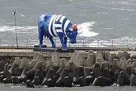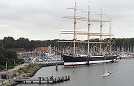 Langsam verlässt die Fähre später den Hafen von Ventspils, auch ohne Abschiedsbier wollen wir die tolle Aussicht auf Stadt, Hafen und das Meer nicht verpassen. Das Schiff passiert die blaue Abschiedskuh an der Hafenausfahrt und schon bald sind wir raus - Adios Ventspils!