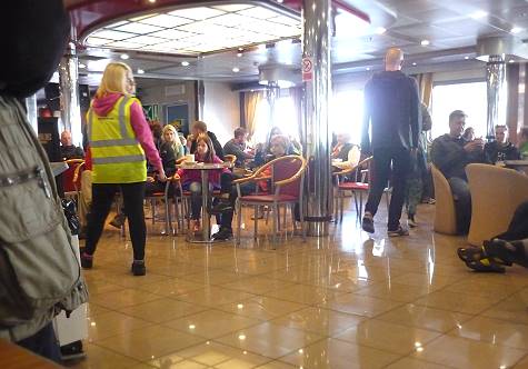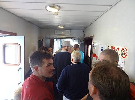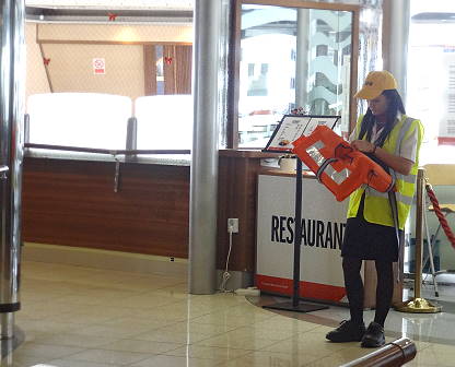 Wir lassen die Veranstaltung über uns ergehen, die wir so noch nie an Bord einer Fähre erlebt haben und bei der fast schon sentimentale Gefühle in Erinnerung an den ersten Tag mit Seenotrettungsübung bei einer Kreuzfahrt mit AIDA im Vorjahr aufkommen ...