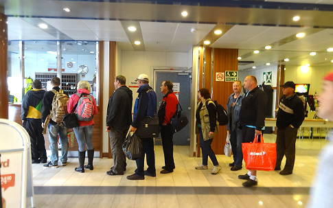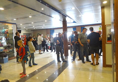 Als wir das Fahrzeug schließlich geparkt haben und die Treppen in Richtung Rezeption hinaufsteigen, schwant uns schnell, dass hier vermutlich ein sehr würdiges Ende unserer Fähren-Odyssee vor uns liegt: Nach der bisherigen Abfertigungsprozedur ist es nun eine sehr lange Menschenschlange, die sich hier im Treppenhaus gebildet hat und darauf wartet, dass vorn etwas voran geht ...