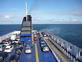 Die Sicht nach hinten wird etwas behindert durch die im Wind flatternde Fahne des Schiffes: Die Stena Line Scandinavia AB hat zwar ihren Sitz in Göteborg, Schweden, das Schiff selbst aber hat den Heimathafen London und fährt unter britischer Flagge, die hier im Wind vor uns teilweise die Sicht versperrt - an der einzigen Lücke, die noch frei von Passagieren ist. Da bisher offenbar noch niemand auf die Idee gekommen ist, diese Flagge - erfreut durch Willkommenskultur, Abfertigungsprocedere sowie Bordservice - anzuzünden, weichen wir nach Backbord aus.