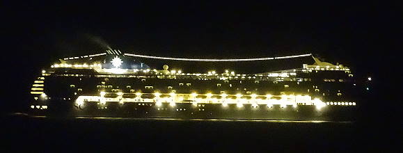 Bei Anbruch der Nacht noch ein ganz erstaunliches Wiedersehen: Aus unserer Kabine können wir hinüber schauen zu einem hell erleuchteten "echten" Kreuzfahrer, den wir bereits bestens kennengelernt haben: Die MSC POESIA begleitet uns heute Nacht noch ein ganzes Stück fast in Parallelfahrt auf ihrem Weg in die Ostsee und man wird fast wehmütig, wenn man an die letzten Begegnungen mit ihr denkt: Sowohl in Marseille als auch in Barcelona hatte dieses Schiff bereits direkt in unserer Nähe gelegen - allerdings war die damalige AIDAmar mit unserer heutigen STENA FLAVIA nicht ganz vergleichbar - zum Glück ..!