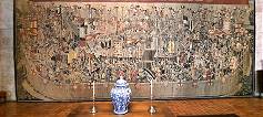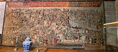 Mir fallen diese großen Wandteppiche natürlich sofort auf: Es sind allerdings nicht nur einfach Teppiche mit einem besonderen Muster. Diese hier wurden so gefertigt, dass es riesige Bilder aus der Geschichte Portugals wurden. So ist dort zum Beispiel die Belagerung und Einnahme der marokkanischen Stadt Arzila (marokkanisch Asilah) und die Eroberung Tangers zu sehen. Auch in Portugal findet sich ein Ort mit diesem Namen. Er liegt bei der Stadt Coimbra. Asilah in Marokko hat heute etwa 35.000 Einwohner und ist zu einem der wichtigsten Touristenorte des Landes geworden.