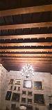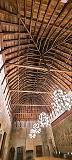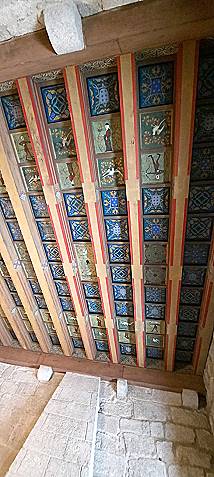 Die großen Räume, in denen größere Zusammenkünfte abgehalten wurden, haben zum Dach keine Zwischendecke. Ich bestaune ungehindert die Bauweise der Handwerker. Alles ist gut zu erkennen, das Holz wirkt sehr gepflegt. Auch die Räume mit Zwischendecke sind mit schön gearbeiteten Decken versehen. Teilweise wurde sogar der Raum zwischen den Deckenbalken kunstvoll verziert. Auf dem Bild oben Mitte ist sogar eine künstlerische Fliesenverlegung mit Bildmotiven zwischen den Balken zu sehen.