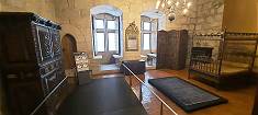 Zwei Räume sind zurecht gemacht als eine Art Esszimmer und ein Schlafzimmer. Wie gut zu erkennen ist, waren bei diesem Bauwerk die Fensterläden innen angebracht. Man brauchte sich also nicht nach draußen zu beugen, um sie zu schließen. Auf dem oben rechts ist die große, schwarze Fläche im Vordergrund wieder die Rampe, um die Räume für Rollstuhl und Kinderwagen sicher zugänglich zu machen. Wer sich gern einmal richtig alte Möbel ansehen möchte, ist hier genau richtig. Alle Möbel sehen aus wie nie benutzt, sie sind hervorragend restauriert worden. Ich finde nicht einmal Staub darauf. In dem Schlafzimmer sehe ich sofort: Dieses Bett wäre für mich zu kurz! Durch den dekorativen Unterbau des Teppichs sieht das aus wie eine Matratze für Gäste, die vor dem Doppelbett auf dem Boden liegt ...