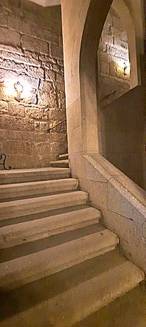 Über das völlig steinerne Treppenhaus gelange ich hinauf in den ersten Stock: Die Sitzbänke an den Fenstern dienten zum bequemen Hinausschauen bei geöffneten Fenstern. Ich sehe mir nun die großen Räume an: Man kann sie fast schon als Säle bezeichnen. Die kleinen Feuerstellen haben solche sehr großen Räume sicher nicht umfassend erwärmt.