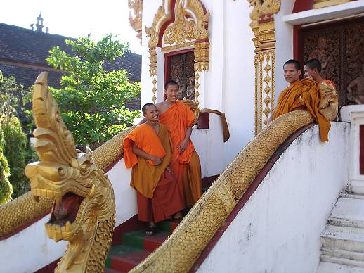 Mein treuester Wegweiser war der Mekong, der sich, wenn ich mich auf dem richtigen Weg befand, rechts von mir von Laos auf Kambodscha zu bewegte. Auf diese Weise fand ich an meinem dritten Tag auch nach Pak Kading, ein pittoreskes Fischerdorf mitten im Übergang. Noch waren die Dorfstraßen mit glutrotem Staub bedeckt. Noch schliefen Hunde auf ihnen, und Schweine lagen in den wenigen Schattenplätzen. Noch lag der buddhistische Tempel, von Touristen unentdeckt, idyllisch am Ufer des Mekong, von dem aus das benachbarte Thailand zu sehen war. Noch versteckten sich Kinder hinter den Beinen ihrer Eltern, sobald sie mich erblickten.