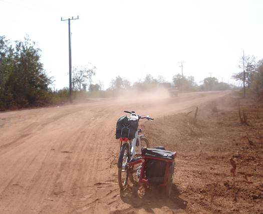 Wenn es nur eine Straße geben würde, die diesen Namen verdiente! Mit jedem Tag, den ich im Dreck und Staub unterwegs war, war ich verblüffter, dass ich noch immer ein Fahrrad unter mir hatte. Mit zwanzig Stundenkilometern krachte mein SMIKE in badewannengroße Schlaglöcher. Der Beiwagen vollführte tollkühne Bocksprünge, wenn ein Stein oder ein Stück Holz unter sein Rad geriet. Auf den Abschnitten mit Wellblech wurden wir beide durchgerüttelt wie bei einem Schüttelfrost. Von oben bis unten besudelt gelangte ich schließlich nach Poipet, die letzte kambodschanische Stadt vor der thailändischen Grenze. Mein Zustand passte indessen gut zu jenem der Stadt: Poipet strengt sich an, um sein Image als schmuddeliger Sündenpfuhl aufrecht zu erhalten. Statt beispielsweise in Straßenbaumaßnahmen zu investieren, zog man vor zwei Jahren neben den aufgereihten Bordellen einen immensen Kasinokomplex hoch, dessen gepflegte Glasfront heftig mit den Bettlern und Minenopfern kontrastiert, die junge Thailänder vor der Eingangstür um ein paar Baht bitten.