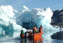 Die Ausrüstung gepackt, unsere Zelte abgebaut und es geht am nächsten Morgen hinaus aus dem Fjord. Willkommen im größten Skulpturenmuseum der Welt! Funkelnd wie Millionen von Diamanten ragen Eisblöcke empor, erheben sich die Festungen aus Eis vor uns. Schlösser von gigantischer Kulisse. Wir entdecken Kunstwerke wie kein Künstler sie schaffen kann, Gemälde wie kein Maler sie malen kann. Wir entdecken die Schönheit der Monotonie ...