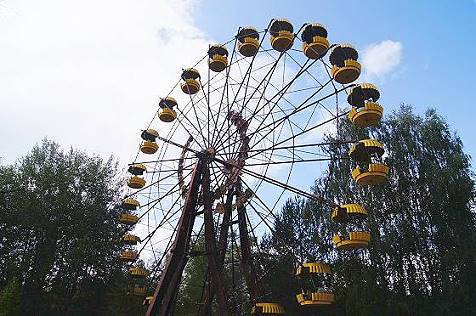 Unser Guide zeigt uns Bilder, wie dies vorher alles aussah. Es ist nicht mehr wiederzuerkennen: Es ist wie in einem Film. Wir können nicht glauben was wir sehen. Von hier aus geht es hinüber zum berühmten Vergnügungspark mit seinem Riesenrad und dem Autoscooter. Wir fotografieren eifrig weiter und ich muss dringend auf die Toilette. Ich kann leider nicht an den nächsten Baum gehen, denn mein Urin könnte radioaktiven Staub aufwirbeln, der wiederum lebensgefährlich ist. Oh, was für eine Qual!
