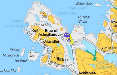 Die Ednard Bay liegt westlich neben uns und hinter der Kurve Richtung Westnordwest sehen wir ihn schon: unseren nächsten geplanten Campingplatz bei Brae of Achnahaird (N58°04.04´ W005°21.98´) - wie wir bald feststellen, der landschaftlich schönste der gesamten bisherigen Tour.