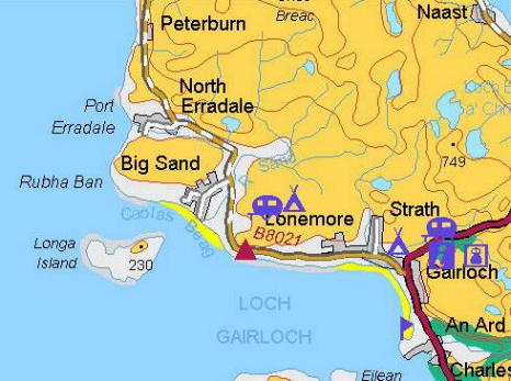 Nur noch wenig weiter muss man der A8021 hinter Gairloch folgen, bis man Lonemore Camping Big Sand erreicht (Vorsicht: kurz hinter Gairloch mitten in einer Linkskurve ein tückisches Viehgitter, auf dem man im Linksverkehr problemlos auf die rechte Seite rutschen kann bei nassem Untergrund!).