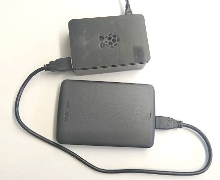 Im Bild links sieht man den Raspberry Pi III mit Wlan und externer 2,5 Zoll USB Festplatte.