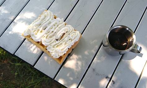 Nach geglückter Espressoproduktion steht der Dekadenz mit Sprühsahne auf der Waffel schließlich nichts mehr im Wege: Die Erdbeeren waren leider vor dem Foto unten rechts schon pur aufgegessen. Zuhause benutze ich eine Mühle, um die Bohnen frisch zu mahlen und eine ROK Handpresse.