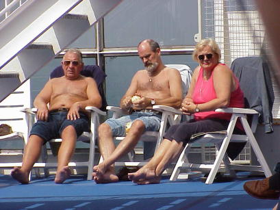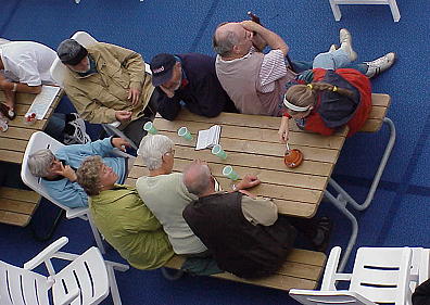 Vom Frühstück an über den Brunch bis zum Abendessen gibt es reservierte Tische. Hat man etwa seine regelmäßigen "Mitsitzer" am Tisch beim ersten unauffälligem Vorbeilaufen als unsympathische Figuren entdeckt und eingestuft, meidet man sie natürlich fortan, sei es, dass man an (inzwischen!) garantiert leeren anderen Tischen Platz nimmt oder aber zur frühest möglichen Frühstückszeit erscheint - das bordeigene "Katz-und-Maus-Spiel" ist eröffnet!
