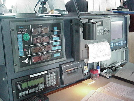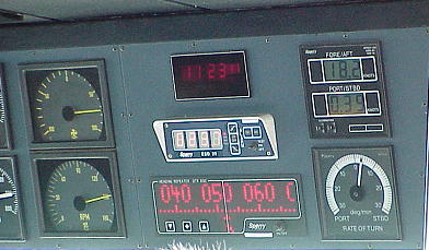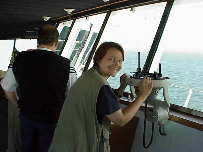 Der Einladung des 1. Offiziers auf die Brücke des Finnclippers können wir nicht widerstehen. Als erstes fällt uns dort allerdings auf, dass wir möglicherweise einen neuen Fehler unserer Suuntos verkraften müssen: Scheinbar 4 mbar zu wenig zeigen sie an, denn sie bringen nur 1000 mbar Umgebungsluftdruck, während der bordeigene Luftdruckmesser auf der Brücke 1.004 mbar ausweist - auf Rückfrage erklärt der Diensthabende, alles wäre auf "Sea Level" geeicht ... Nun, wir werden es auf dieser Tour nicht beweisen können!