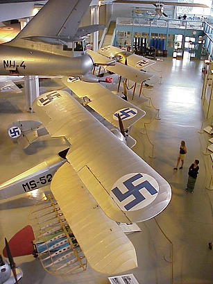 "Blaue Swastika (Hakenkreuze) wurden auf die Flächen des ersten Flugzeugs der finnischen Luftwaffe in Umea gemalt (Der Spender des Fluzeugs: Graf Eric von Rosen). ... Die von der finnischen Luftwaffe von 1918-45 benutzten Swastika haben keine Verbindung mit den deutschen Nazi-Hakenkreuzen, die auf Flugzeugen schwarz waren und auf der Spitze standen ... Bei Swastikas handelt es sich um frühzeitliche Ornamente, die in verschiedenen Teilen von Europa und Asien gefunden, aber auch in Afrika und Amerika entdeckt wurden ..."