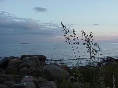 Bottnischer Meerbusen: Eigentlich auch nicht anders als viele bisher gesehene große finnische Seen, nur kann man an manchen Stellen von hier aus eben Wasser bis zum Horizont sehen. Dennoch: Kaum anders als sonst, man ist halt schon wieder verwöhnt mittlerweile, wenn man abends die Stimmung der (kaum noch) untergehenden Sonne genießt - und seine Freundinnen vertreiben kann ...