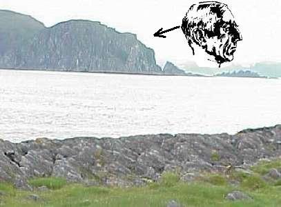 Gegenüber von Steinvag ist er nun sehr gut zu sehen: Der legendäre Felsen, der die Umrisse des berühmten norwegischen Arktisforschers Roald Amundsen trägt - in der Tat scheint der Alte da hinten ruhend im Wasser zu liegen, die Vorderseite seines Gesichtes ragt in beeindruckender Weise aus der See ...