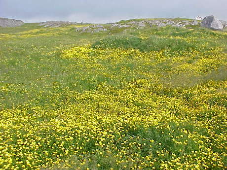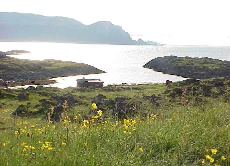 "Von niedrigen Bergen umgrenzt mit Aussicht auf das Meer, fließt ein Bach über die Ebene. Ein Pfad, ein zusammengebrochener Brunnen und was wahrscheinlich eine Räucherei gewesen ist, erzählen ihre Geschichte. Die Steinzäune markieren eine Trennung zwischen Flut- und Ödland, auf dem Boden sieht man Spuren von Torfsodenabstechung. Die deutlichsten Spuren menschlicher Tätigkeit sind die Grundstücke zweier zusammengebauter Häuser. ... Aus dem letzten Krieg sehen wir die Reste einer Booterdhütte, auf den Grundstücken zweier Häuser gebaut. Eine Erdhütte mit einem umgekippten Boot als Dach, im Evakuierungsherbst 1944 von einer Familie mit drei Kindern benutzt, ragt aus dem Gelände."