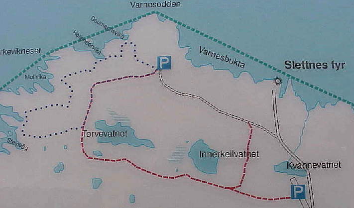 Am nördlichen Parkplatz (N71°05.44748´ E028°11.30025´) beginnt der Rundwanderweg, der in unserer Karte gepunktet eingezeichnet ist. Obwohl es sich hier um ein Naturreservat handelt, finden sich an diesem Parkplatz wilde Camper, die "Mr. Hilly" verständlicherweise "innig" liebt und gegen die hier leider niemand vorgeht. So kann es einem passieren, dass liebenswerte Zeitgenossen wie "Doris & Hermann on Tour" mit ihrem Wohnwagen sogar direkt auf dem Beginn des Wanderwegs campen und man sich als Wanderer daran vorbei zwängen muss! Diese Camper sollten zahlen, meint Hildor (zu Recht, wie wir meinen!) - eine Goldgrube, die wohl hier nicht genutzt würde. Wer kann ihm verdenken, dass er nach seinen Erfahrungen mit Deutschen seit den Zeiten der Festung Gamvik (siehe hierzu unser Schwerpunktthema) meint, die Deutschen kämen jetzt anstatt mit Waffen mit Wohnmobilen ...