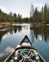 Da ich ja solo unterwegs war, hatte ich nicht mein Dickschiff mitgenommen, den großen "Yoho III". Stattdessen benutzte ich meinen über dreißig Jahre alten Aluminium Canadier, den ich vor zwei Jahren in Schweden in arg desolatem Zustand gekauft hatte. Den darauf folgenden Winter nutzte ich zur Restaurierung, heraus kam dabei ein passabler Zweier-Canadier, der sich aber auch gut solo paddeln ließ. Da ich ohne Persenning paddelte, war alles Gepäck wasserdicht verstaut. Auch wenn der Wetterbericht keinen Regen in Aussicht gestellt hatte: Sicher ist sicher!