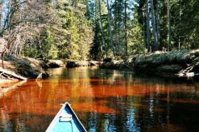 Im weiteren Verlauf zog sich der Fluss immer noch in unzähligen Kurven und Schlingen durch den Wald, doch die noch folgenden Schwallstrecken waren zum Glück weniger dramatisch und so rutschte ich mit etwas Staken und Schieben über die flachen Stellen hinweg.