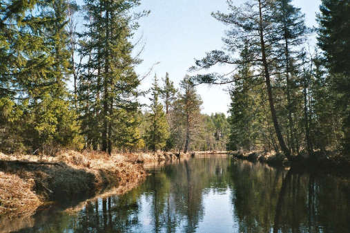 Ich begann danach in aller Ruhe, meine Ausrüstung zu verstauen und gegen 11:00 Uhr machte ich mich wieder auf den Weg. Der "Nittälven" wurde jetzt in längeren Abschnitten breiter und floss überwiegend durch hochstämmigen Wald. Das Flussbett bestand jetzt aus feinstem Sand und die Sonnenstrahlen schienen bis auf den Grund des zwar dunkelbraunen, aber absolut klaren Wassers ...