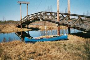 Ein lautes Rauschen kündigte die auf der Karte verzeichnete größte Schwallstrecke an. Ich landete kurz vorher an und besichtigte die Sache. Mit ein wenig mehr Wasser wäre es eigentlich überhaupt kein Problem gewesen: Es handelte sich um eine lang gezogene Stromschnelle, die auch noch in einer Rechtskurve auslief. Es waren geschätzte ca. 300 Meter, die aber gar nicht gut aussahen: Es war keine deutliche Fahrrinne auszumachen. Stein neben Stein, und wirklich wenig Platz dazwischen. Der um etwa 20 cm zu niedrige Wasserstand machte die an sich leichte Schnelle recht schwierig, besonders wenn man mit einem vollbeladenen Boot unterwegs war. Eine Alternative wäre etwa 200 Meter mühsames Umtragen allen Gepäcks und des Bootes durch den Wald gewesen, auf einem schmalen Fußpfad. Ich hätte natürlich auch nur mit dem leeren Boot fahren können. Aber ein Aluminium Canadier ist sowieso bei Stromschnellen die letzte Wahl: Nichts verkeilt sich so gut und rutscht so schlecht wie Alu auf Stein!