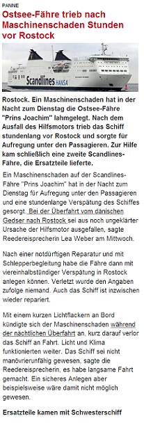 Statt der gebuchten Prins Joachim schaffen wir eine Fähre früher und verlassen Dänemark stattdessen mit der Kronprins Frederik Richtung Rostock. Wie wir erst später erfahren, blieb die Prins Joachim knapp 3 Wochen zuvor, in der Nacht zum 7.8.12, mit einem Maschinenschaden liegen und trieb danach stundenlang vor Rostock (siehe links). Das passiert uns zum Glück nicht, wir erreichen problemlos Rostock und beschließen spontan in Anbetracht schwarzer Wände vor uns Richtung Süden, direkt weiter zu fahren zum Camp der Etappe 13. Sind schließlich nur ein paar Kilometer und durch die frühere Fähre sind wir auch gut in der Zeit! |