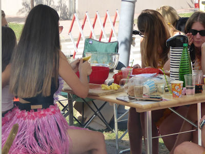 An den Ständen wird eifrig Holz gespalten, Feuer gemacht, Zwiebeln gebrutzelt, das Fleisch geschmort, gerührt und gerührt und gerührt und abgeschmeckt sowie manche geheime Zutat in den Topf geschüttet. Die Kleidung der Köche und Küchenhilfen lässt staunen: Da sitzen schon mal die Mädchen aus der Hawaitanzgruppe im Kostüm und schnibbeln Kartoffeln, ältere Herren glauben, ein nackter Oberkörper mit Schürze hat Sex-Appeal, bei Firmen werden einheitliche T-Shirts mit Logo getragen.
