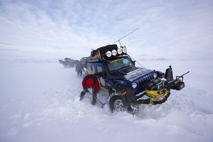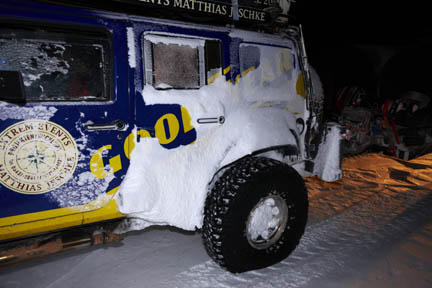 Wir öffneten im Sturm die Motorhaube und sahen, dass der Motorraum - obwohl von allen Seiten spezialisoliert - über und über mit Eis bedeckt war. Wie durch unsere Türen, hatte der Sturm in den Motorraum gedrückt. Das Eis, das sich bildete, hatte dann die Elektrolüfter festfrieren lassen. Wir fuhren weiter, um den CAT nicht zu verlieren, immer an der Grenze zum roten Bereich.