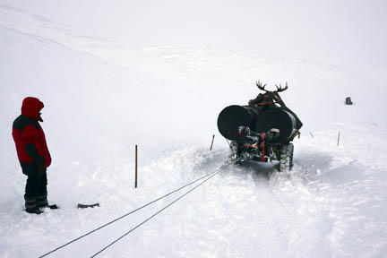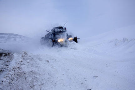Wir gratulierten und verabschiedeten uns achtungsvoll voneinander in dem Wissen, jeder hat diese schwierige Situation sehr gut gemeistert. In 9 Stunden legten wir die 18 km zurück, die uns von der Außenwelt trennten. Meter für Meter: 2 m vorwärts = 1-2 m Schneehöhe beseitigen. Teilweise grub sich der CAT aber auch bis übers Dach in den Schnee ein. Ich zog Kaspars Gespann mit dem F1-Gespann etwa die Hälfte der Strecke, die andere versuchte er so gut es irgend ging, knapp unter dem roten Bereich zu fahren. Er ist ein wirklich guter und sehr besonnener Fahrer ...