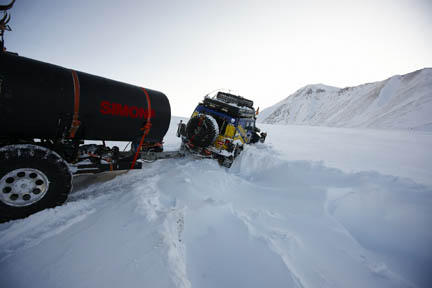 Sind durchgekommen bis zu der Stelle, wo die Trucks eingeschneit gewesen sein mussten. Die Spuren, die wir sahen, deuteten darauf hin, dass sie als erstes von einem russischen Kettentransportfahrzeug erreicht worden sein mussten. Ca. 10 km weiter trafen wir dann auf das größte CAT Kettenfahrzeug der Welt - einen D10. Wirklich unglaubliche Dimensionen. Alleine der Fahrerkabinenboden befindet sich in gut 4 Metern Höhe. Der Einfachheit halber zieht er hinter sich einen riesigen Schlitten her, der gleichzeitig ein Haus, ein riesiges Tanklager und Schneepflug ist ...