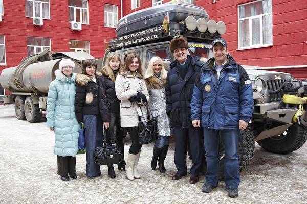 In Ekatarinburg waren wir von der Generalkonsulin und der Technischen Hochschule eingeladen, unser Projekt zu präsentieren. Wir wurden vom Hochschulpräsidenten persönlich begrüßt und über die Technische Hochschule mit ihren 43.000 Studenten informiert. Zur Expeditionspräsentation, die hervorragend vom Konsulat vorbereitet wurde, waren sowohl Studenten als auch Pressevertreter, vor allem aber zahlreiche TV-Teams mit Kameras, anwesend. Der Erfolg dieser Veranstaltung hat sich entsprechend direkt bemerkbar gemacht: Wir waren die Attraktion der Hauptnachrichten um 20 Uhr im zweiten russischen TV-Kanal! Neben Aufnahmen von Jeeps und Trailern waren auch Interviews mit Matthias und Evgeny zu sehen. Seither sind wir in ganz Russland bekannt!