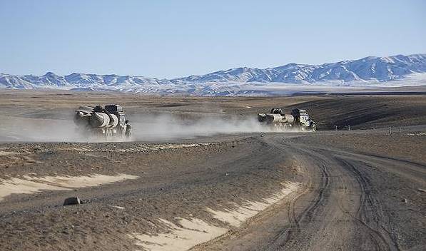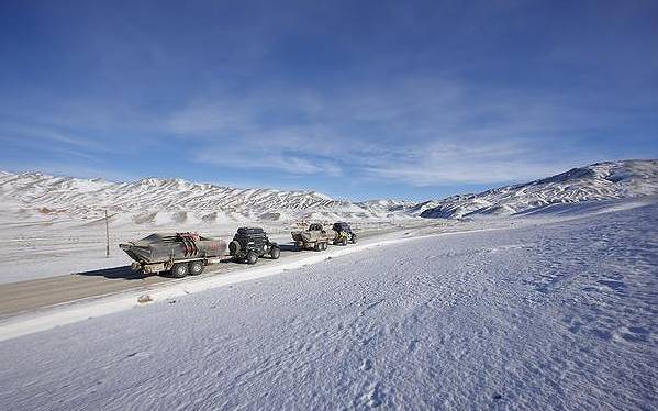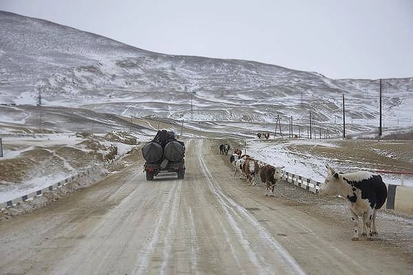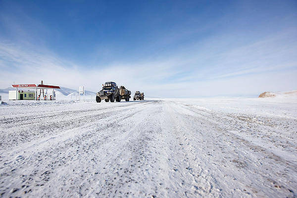 Bei strahlendem Sonnenschein sind wir am Montagmorgen in Richtung russisch-mongolischer Grenze weitergefahren. Direkt in Kosh Agash mussten wir wegen unserer Dolmetscherin, die uns bis zur Grenzabwicklung auf russischer Seite begleiten sollte, beim Grenzamt vorsprechen. Ein unerwarteter Zusatztermin, der direkt dafür gesorgt hat, dass Matthias kein gutes Gefühl mehr im Hinblick auf die bevorstehende Grenzdurchfahrt hatte. Von da ab ging es auf einer kilometerlangen schnurgeraden Straße durch eine verschneite Hochebene ständig bergauf. Im Blick hatten wir die beginnenden Berge und eine vage Idee einer Rechtskurve am Horizont. Hier gab es noch einmal einen Foto- und Filmstopp: Landschaft, Lands-end-Stimmung und das fantastische Licht mussten einfach festgehalten werden ...