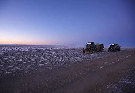 Als die Landschaft gerade so richtig überwältigend war - ein weites, von Bergen umringtes Hochplateau-Tal, Seen links und rechts und ein Sonnenuntergang, wie er kitschiger nicht hätte sein können - wartete noch ein echter Offroad-Einsatz auf uns. Vor uns war ein Laster bei der Durchfahrung eines Flussbetts ins Eis eingebrochen. Die beiden Fahrer hatten bereits die gesamte Ladung neben dem Fahrzeug gestapelt und sich ein provisorisches Zelt aus einem abgespannten Tuch gebaut. Nicht viel angesichts von inzwischen minus 24 Grad Kälte und scharfem Wind. Sie warteten bereits seit zwei Tagen auf Hilfe. Kurz entschlossen hat Matthias die Winde am F1 aktiviert.