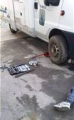 Eilig rafft er sämtliches Werkzeug zusammen, es geht damit zügig zurück zum LERRY. Kurz darauf ist der Reservereifen bereits aus der Halterung befreit und vorn wieder auf der Achse. Sofort macht sich der hilfsbereite Mann wieder mit dem kaputten Reifen auf den Rückweg zu seiner Werkstatt. Ich folge ihm mit meinem Auto und komme gleich hinterher. Das Womo muss in die Halle hinein und es geht schnell weiter: Bei diesem Mann passt einfach jeder Handgriff! Nebenbei zeigt er mir noch den Schaden am Reifen und wie er ihn repariert. Der Wagen ist gut in Schuss, meint er freudig.