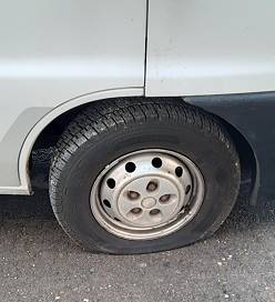 Als ich zurück komme, hält der LERRY eine Überraschung für mich bereit: Er scheint sich nicht so recht wohlzufühlen. Es sieht nach "Atemnot" auf dem rechten "Lungenflügel" aus! Ich erinnere mich, heute ist der 30. Dezember 2022, alles ist geschlossen. Doch ich habe Glück: Mein alter LERRY hat tatsächlich noch einen Reservereifen. Das ist bei den modernen Wohnmobilen nicht mehr so. Außerdem habe ich den ADAC, auch das ist gut. Dann keimt noch ein ganz klein wenig Optimismus auf, ich erkenne, der Reifen ist ja nur unten platt!