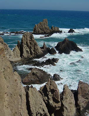 Die Straße zum Kap verläuft direkt an einem fast menschenleeren, über 8 km langen Kiesstrand. Es ist immer wieder verwunderlich, wie wenig Badende an den Stränden der Region zu sehen sind. Hoffentlich bleibt dies auch so. In der Hochsaison im August vervielfacht sich allerdings das Besucheraufkommen, da vor allem Spanier, die in dieser Zeit fast alle im Urlaub sind, gerne diese Region besuchen. Trotzdem sind Zustände wie in den bekannten Tourismuszentren hier noch weit weg ...