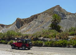 Von Santa Fe aus führt übrigens der unbefestigte Weg von einem Rambla in ein anderes, viel größeres Flusstal, das ohne Allradfahrzeug nicht befahren werden sollte. Der staubige Weg führt durch viele Weichsandfelder, sumpfige Stellen und über Sandbänke. Irgendwie nimmt das Tal kein Ende. In einer Plantage an einer wasserführenden Stelle finden sich ein paar freundliche Arbeiter, deren Capo sich redlich abmüht zu erklären, dass ein Bekannter von ihm Archäologe aus Deutschland sei und bei Rodalquillar die alten Goldminen untersucht. Mit viel Mühe beschreibt er einen Weg zurück zu einer befestigten Straße und gibt uns zum Abschied zwei große, zuckersüße Wassermelonen und ein paar herrliche Tomaten mit. Als Wegmarke beschreibt er einen Punkt mit Aussicht auf das europäische Weltraumobservatorium auf dem Monte Alto.