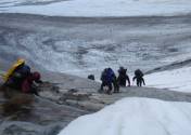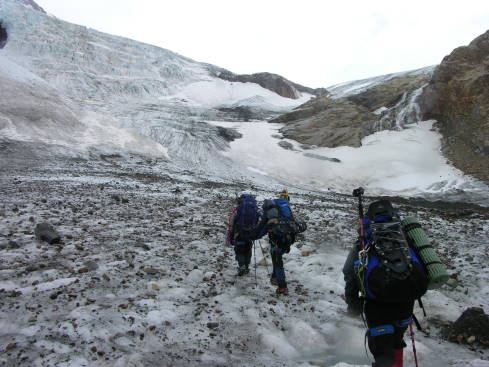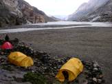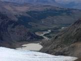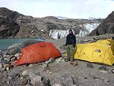 Ein letztes Mal gehen wir aufs Eis des Glaciar Rio Tunel: Steigeisen sind aber hier nicht mehr nötig, da viel Geröll herumliegt, was guten Halt verspricht. Auch dieses Hindernis lassen wir nach einer halben Stunde hinter uns auf dem Weg zum Camp am Lago Toro (650 m). Kurz danach müssen wir noch den Rio Tunel mit einer Tirolesa überqueren: Sitzgurte werden noch einmal herausgeholt, der Rucksack an einem Karabiner befestigt und schließlich hängen wir uns ein und fahren wie auf einer Seilrutsche auf unseren Rucksäcken sitzend über den Rio Tunel. Jetzt dauert es nicht mehr lang bis zum Camp, vielleicht noch 30 Minuten Marsch.