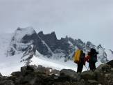 Trotz des Windes gehen wir weiter, da für den 26.12. erneut schlechtes Wetter angesagt ist und somit heute unsere einzige Chance besteht, den Paso zu meistern. Wir gehen im Windschatten unseres Vordermanns, bei jeder Böe bleiben wir stehen und stemmen uns mit aller Kraft gegen den Wind, um nicht umgerissen zu werden: Stop and go a la Patagonia. Die Steigeisen werden angeschnallt, der Hüftgurt angezogen, noch ein zusätzliches Fleece unter die Gore-Tex Jacke gezogen, wir binden uns in Dreier-Seilschaften ein und gehen los. Eisregen und ein regelrechter Orkan begrüßen uns am Einstieg zum Paso Marconi. Stop and Go an 45° steilen Eisflanken und nassem Fels, dazu dieser unberechenbar böige Wind. Passt man da nicht auf wird man glatt weggerissen.