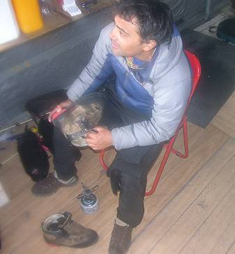 Es dauert keine Stunde bis die Gore-Tex Klamotten durchgeweicht sind. Zu allem Unglück reiße ich mir mit dem Eispickel noch ein Loch in meine Hose - da ist zusätzlicher Wärmeverlust vorprogrammiert und das Wasser kann ungehindert in meinen rechten Schuh fließen. Nach einer Ewigkeit erreichen wir schließlich den Shelter Garcia Soto. Wir alle sind am Ende unserer Kräfte, nichts ist mehr trocken und wir fühlen uns einer Unterkühlung nahe. Bestimmt für jeden von uns der unvergesslichste Weihnachtsabend, den wir je hatten.
