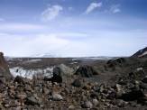 Die Gesichter sind heute unter einer weißen Maske aus Sonnencreme verborgen, um Schlimmeres zu vermeiden. Ich befürchte allerdings trotzdem, dass bei meiner Gesichtshaut fast alle Hilfe zu spät kommt. Es geht über Fels und Geröll steil hinauf zum Paso del Viento. Immer wieder müssen wir stehen bleiben und uns gegen den Wind stemmen. Am Paso angekommen haben wir noch einmal einen wunderschönen letzten Blick auf das Inlandeis in seiner weißen Pracht: Man kann förmlich sehen, wie jeder von uns diese letzten Blicke regelrecht in sich aufsaugt und lange nicht vergessen wird ...