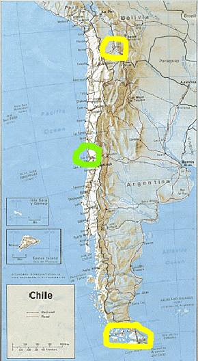 Seit gut eineinhalb Jahren haben wir auf diesen Zeitpunkt hingearbeitet und geplant; morgen um 9:00 Uhr steht die Verladung unseres Fahrzeuges nach Valparaiso an, dem Hafen von Santiago de Chile (grüner Kreis rechts).