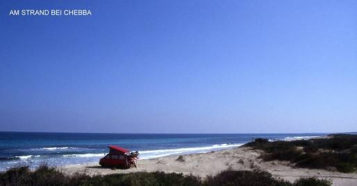 Auf der küstennahen, gut ausgebauten Straße geht´s zügig voran bis kurz vor Chebba: Einige Stichwege führen zum Strand, hier Spitzenstellplätze direkt am Wasser. Ab und zu ein Fischer mit knatterndem Moped, ein freundliches Kopfnicken, sonst paradiesische Einsamkeit. Sanft-welliger Dünengürtel unter stahlblauem Himmel, glasklares, leicht gekräuseltes Meer und Tagestemperaturen von etwa 18°C ... wir bleiben einen Tag und zwei Nächte.
