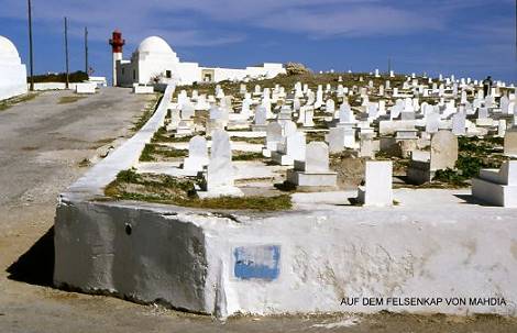 Bei M´Saken geht´s über kleine Landsträßchen und Dörfer Richtung Küste nach Mahdia: Sehr hübsch auf´s Felsenkap gebaute Altstadt mit grellweißen Fassaden. Am windumtosten Landende Riesenfriedhof, idyllisch mit weidenden Schafen und "freier Sicht auf Palästina". Am Schotterrundweg einige Stellplätze für Camper. Tipp zum Verweilen: Der Place de Caire in der Medina, klein und schnuckelig, von ein paar Cafes mit ihren Stühlen beschlagnahmt. Hier lässt es sich bei hervorragendem Cafe Turk oder Thé à la Menthe herrlich abhängen ..