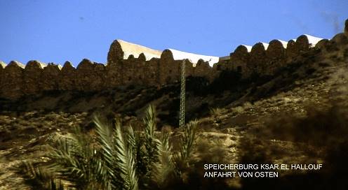 Zeit zum Abbiegen. Wir wollen ins Dahar, nach Ksar EL Hallouf. Spektakulär dort ist die Speicherburg oben auf einem Felssporn mit Blick ringsum. Ein Teil der tonnenförmigen Ghorfas, in denen seinerzeit alles mögliche geschützt gelagert wurde, ist restauriert und fungiert als Restaurant, Wohnraum, Herberge und WC spartanischster Machart. Aber gerade diese Einfachheit der Dinge, diese Exponiertheit zwischen Himmel und Erde und die ungewohnte Geräuschkulisse eines betenden Muezzins mit vielfachem Echo zwischen den Felswänden - all das sind Zutaten, die uns wieder für banalste Empfindungen empfänglich machen, uns auf irgendeine Weise verzaubern und uns dem Pulsschlag eines fremden Kontinents lauschen lassen.