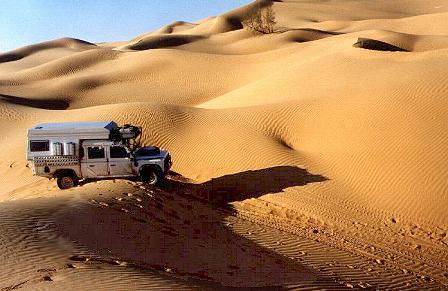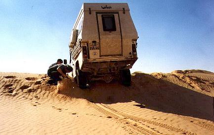 Am 30.12.98 trafen wir dann zufällig auf die anderen, die mit uns die Genehmigung erhalten hatten. Große Freude und Hallo und dann der Beschluss, ein gemeinsames Lager aufzubauen und von dort aus Ausflüge in die Dünenlandschaft des Grand Erg zu starten. Gesagt, getan! Uns gab es schon ein gewisses Maß an Sicherheit, einen IFA und einen MAN und Saharaerfahrung im Hintergrund zu haben. Und zum Üben und Schaufeln hatten wir genug Gelegenheiten ...