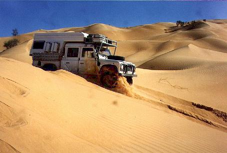 Mit materialmordenden und schweißtreibenden Dünenüberquerungen vertrieben wir unsere Zeit bis zum 03.01.99, dann verließen wir das Sperrgebiet in Richtung Ksar Ghilane. Dort labten sich unsere Kinder an den warmen Quellen, wir amüsierten uns über den Touristennepp. Nachdem wir vorzüglich gegessen hatten (wir schleusten uns in eine Touristengruppe ein), fuhren wir per Piste weiter nach Douz. Auch diese Strecke ist nicht zu unterschätzen, da hieß es ein paar Mal: Luft ablassen und schaufeln ...